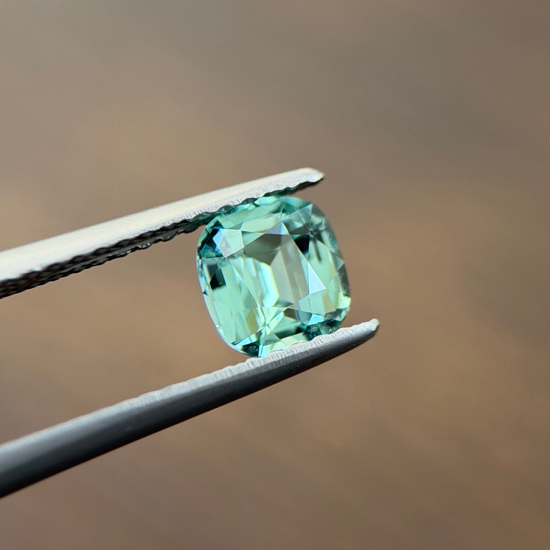 腕利きカッターにより精度の高いカットが施された、シーフォームカラーが魅力的なクッションシェイプのアフガニスタン産トルマリン。ルーペクリーンに近いアイクリーンで、透明度が高いピースです。ぜひ動画もご覧ください。