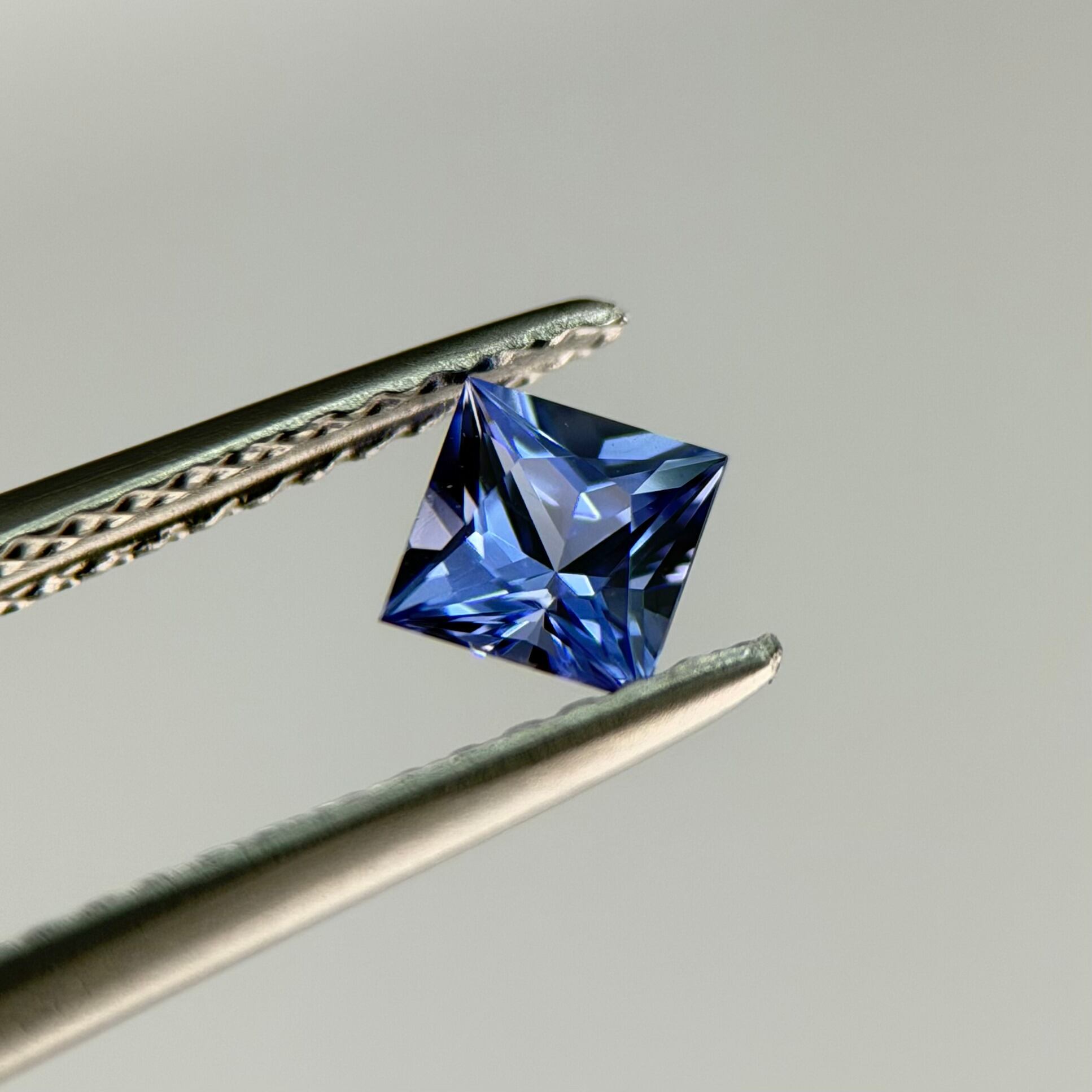 タンザニア・メレラニ産のタンザナイト。腕利きカッターによる精度の高いカットとルーペクリンに近いアイクリーンの透明度、プリンセスカットの直線的な面構成により、光が中心へ向かって収束していく様子が際立つ一石です。