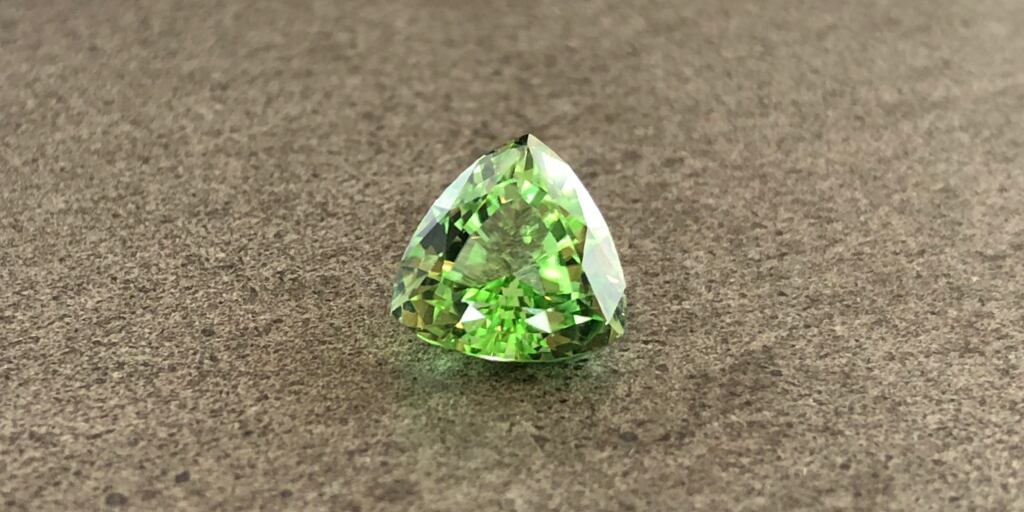 パキスタン産のペリドットの中でも、蛍光ミントカラーの発色が珍しいトリリアントカットのルースとなります。いつも頼りにしている腕利きのカッターによる作品ですので、透明度、カットの精度ともに抜群の一石です。