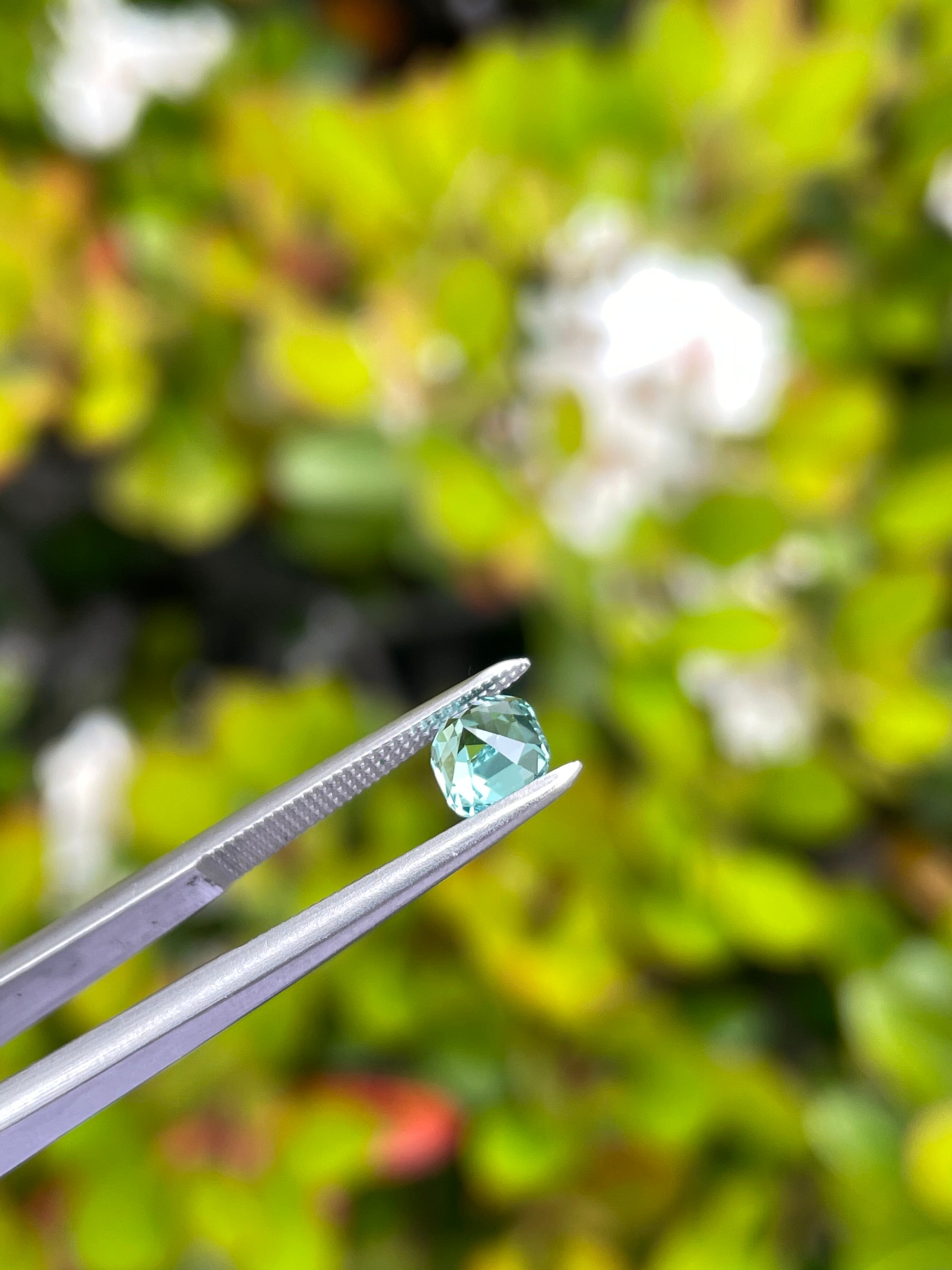 腕利きのカッターによる、ルーペクリーンのラグーントルマリンです。 宝石名: トルマリン 産地: ナミビア産 サイズ: 5.3x4.9mm 重量: 0.70ct