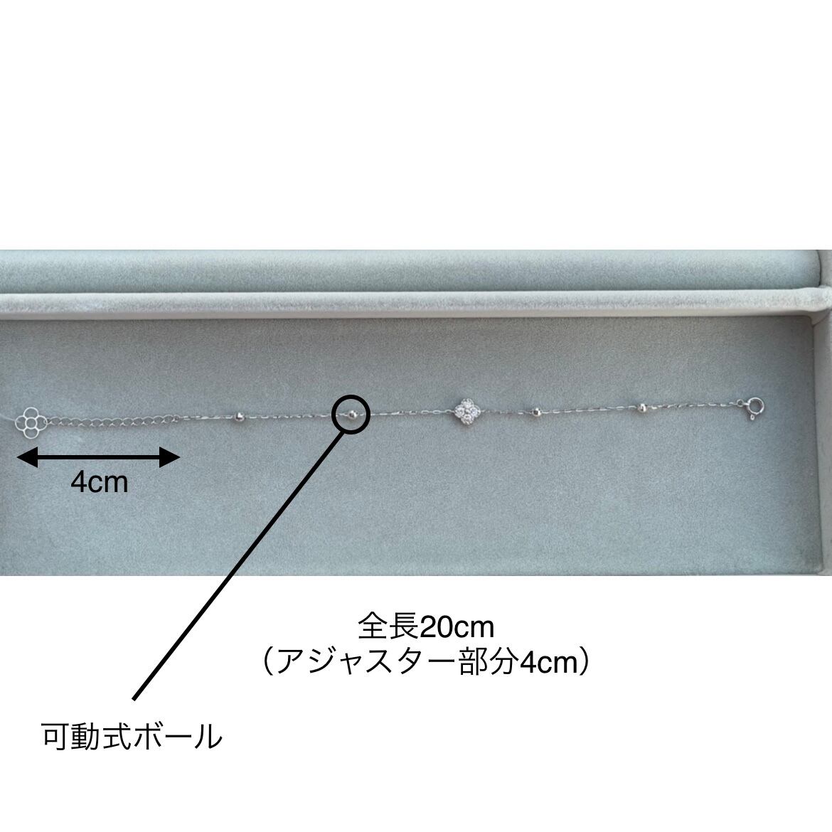 ※K18WG, K18YGの2種類からお選び下さいませ。 四つ葉モチーフで加工したダイヤモンドのブレスレット。チェーンの途中に取り付けられている4つのボールは可動式です。